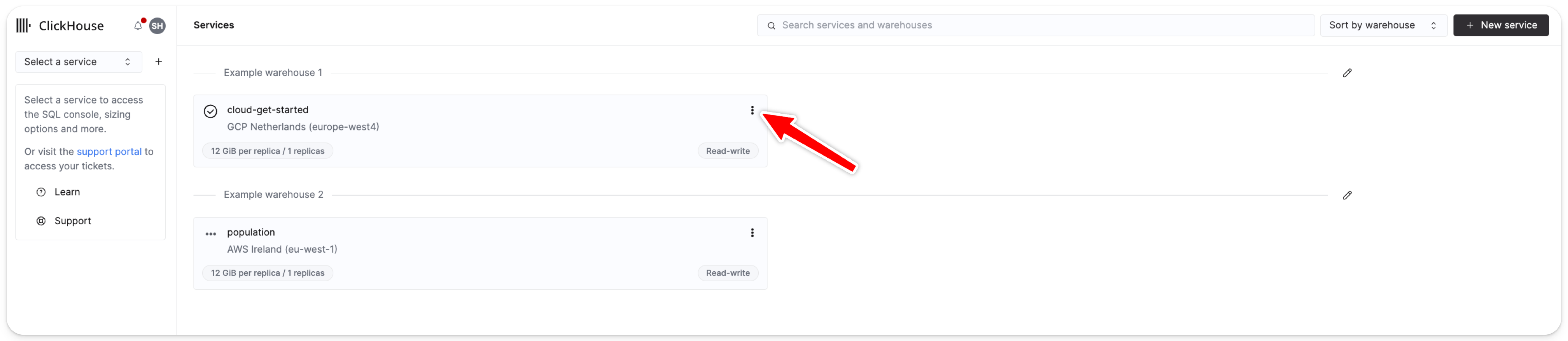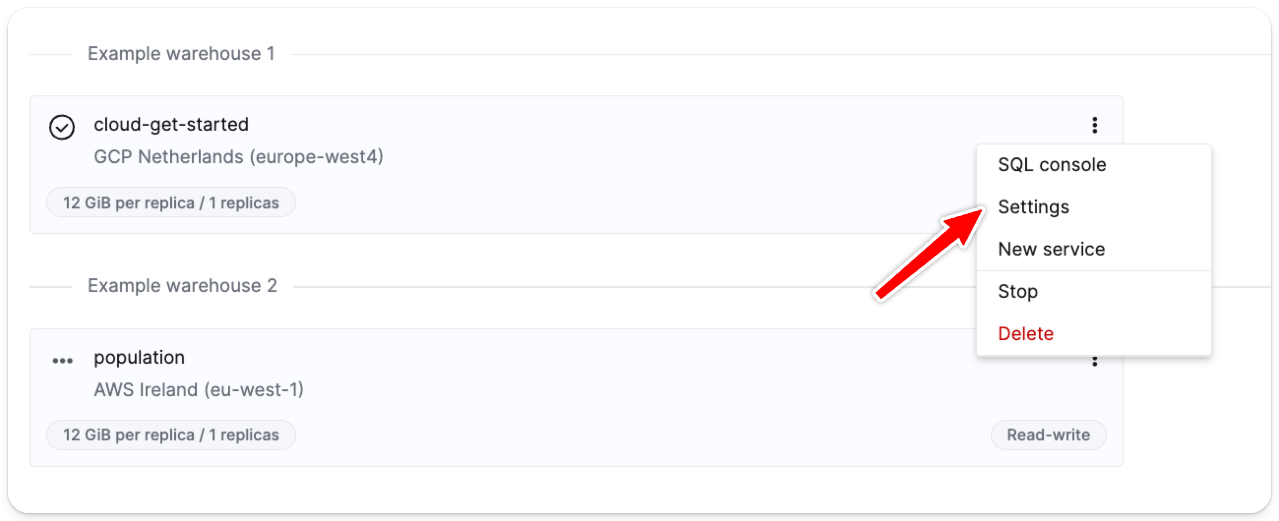 From the services page, click the menu in the top right corner of the service for which you want to adjust SQL console access settings.