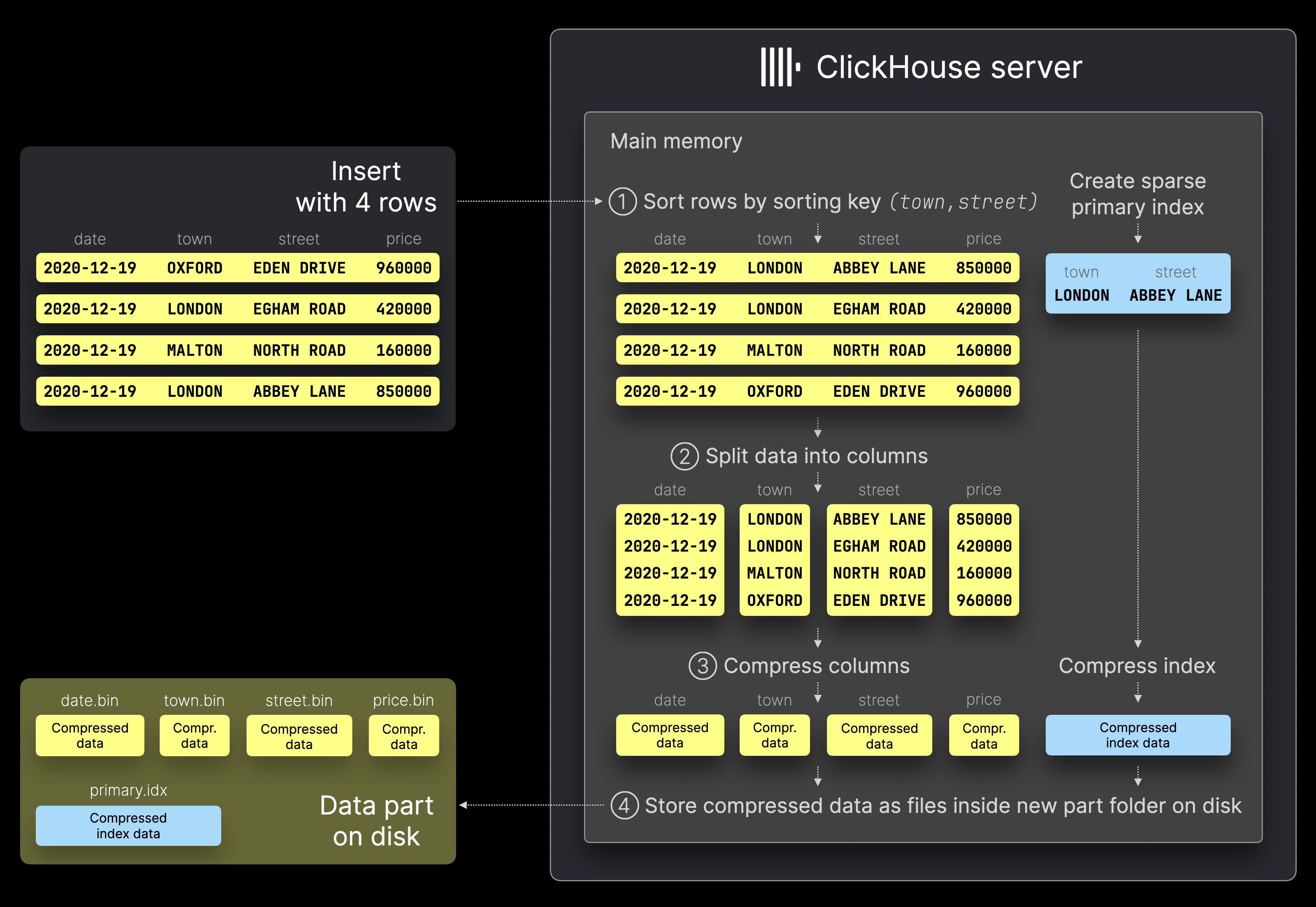 Когда сервер ClickHouse обрабатывает пример вставки с 4 строками (например, через оператор INSERT INTO), изображенный на диаграмме выше, он выполняет несколько шагов: